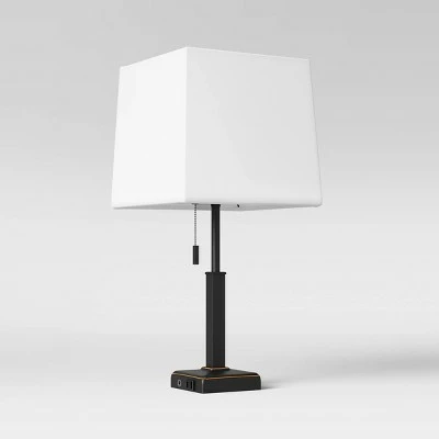 Add polished flair to your space with this Square Table Lamp from Threshold™. The sleek silhouette of this square stick table lamp adds a touch of subtle charm to your living space, while the slim profile allows it to fit neatly on compact surfaces like nightstands or side tables. The included outlet on the base adds extra convenience, while the pull-chain feature makes it easy to turn on and off. The warm bronze color and linen lampshade add classic style to any corner of your home, whether you prefer traditional or contemporary design.
