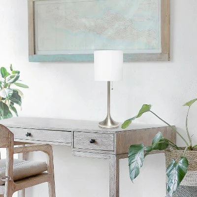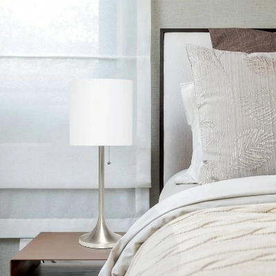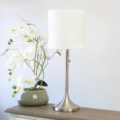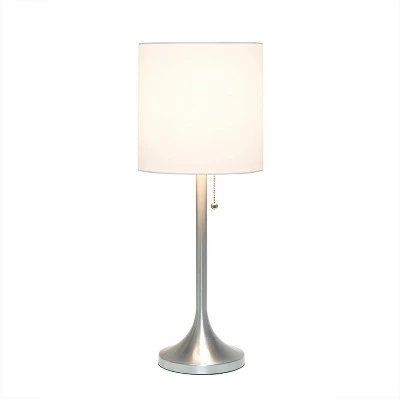 This fun and fashionable desk/task lamp features a brushed nickel metal base and white fabric drum shade making it the perfect addition to your lighting needs. This lamp will add simplicity and style to any space in your home. Perfect for bedrooms, kids and teens, college dorms, nurseries, or fun offices!