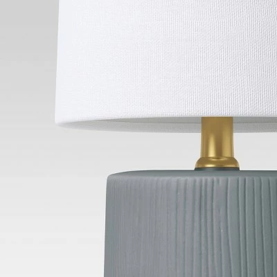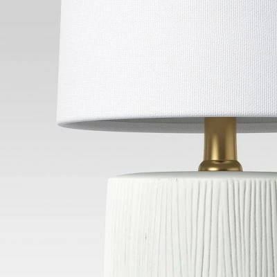 Add some style to your indoor lighting with this Textural Ceramic Mini Cylinder Shaped Table Lamp from Threshold™. This mini cylinder shaped table lamp makes a welcoming accent to your tabletop decor. It features a solid-colored ceramic base with a textured design for chic style. The white fabric shade completes the crisp modern look, while the on/off light setting with a push-through socket switch allows for easy functionality. Place it on any side table, console or sideboard for stylish, warm lighting.