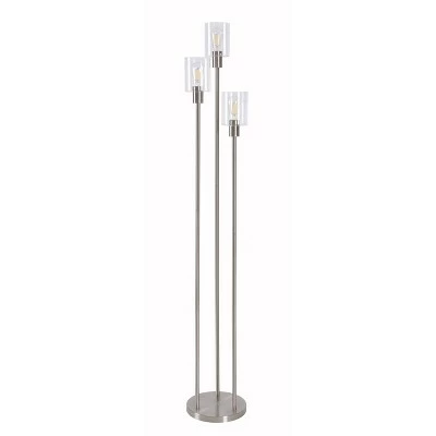 This stylish 3 light torchiere is comprised of a knockout arrangement of mid-century modern style infused with industrial design sensibilities. This lamp is finished with a shimmering brushed steel and clear glass shades, creating plenty of atmospheric lighting in your living room, home office, or master bedroom. The throwback vibe of the lamp is further stressed with the use of a warm vintage Edison bulb.