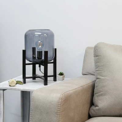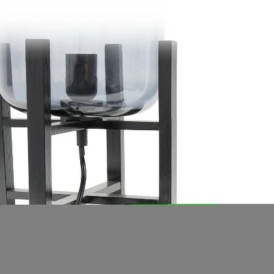 This contemporary lamp elevates the glass shade on a four-arm wood stand finished in black. The curvy cylindrical smokey glass shade combined with the geometric wood base creates the perfect ensemble. Place on a desk, nightstand, dresser or table for a modest, refined look in fashion lighting. HELPFUL TIP: To get the complete vintage look, we recommend using a decorative Edison/Vintage bulb (not included).